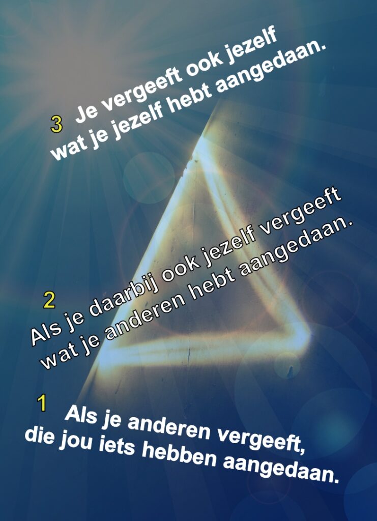 DE DRIEHOEK VAN VERGEVEN: (1) Als je anderen vergeeft, die jou iets hebben aangedaan. (2) Als je daarbij ook jezelf vergeeft wat je anderen hebt aangedaan. (3) En als kers op de taart: je vergeeft ook jezelf wat je jezelf hebt aangedaan. (CC BY-ND)